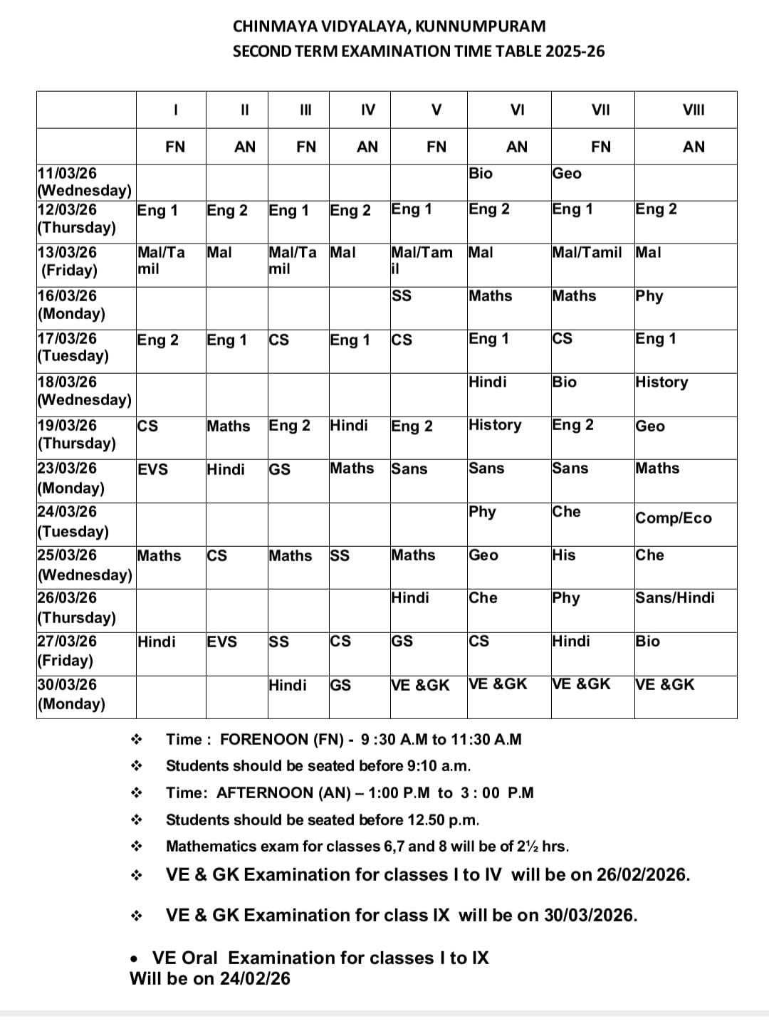 Std I-VIII First Term Exam Timetable