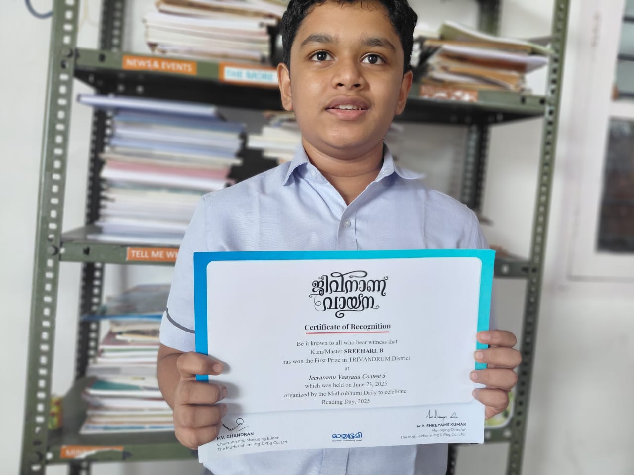 Srihari B(9B) from Thiruvananthapuram district won the first prize in the reading-based program “Jeevananu Vayana” organized by Mathrubhumi daily on June 23.
